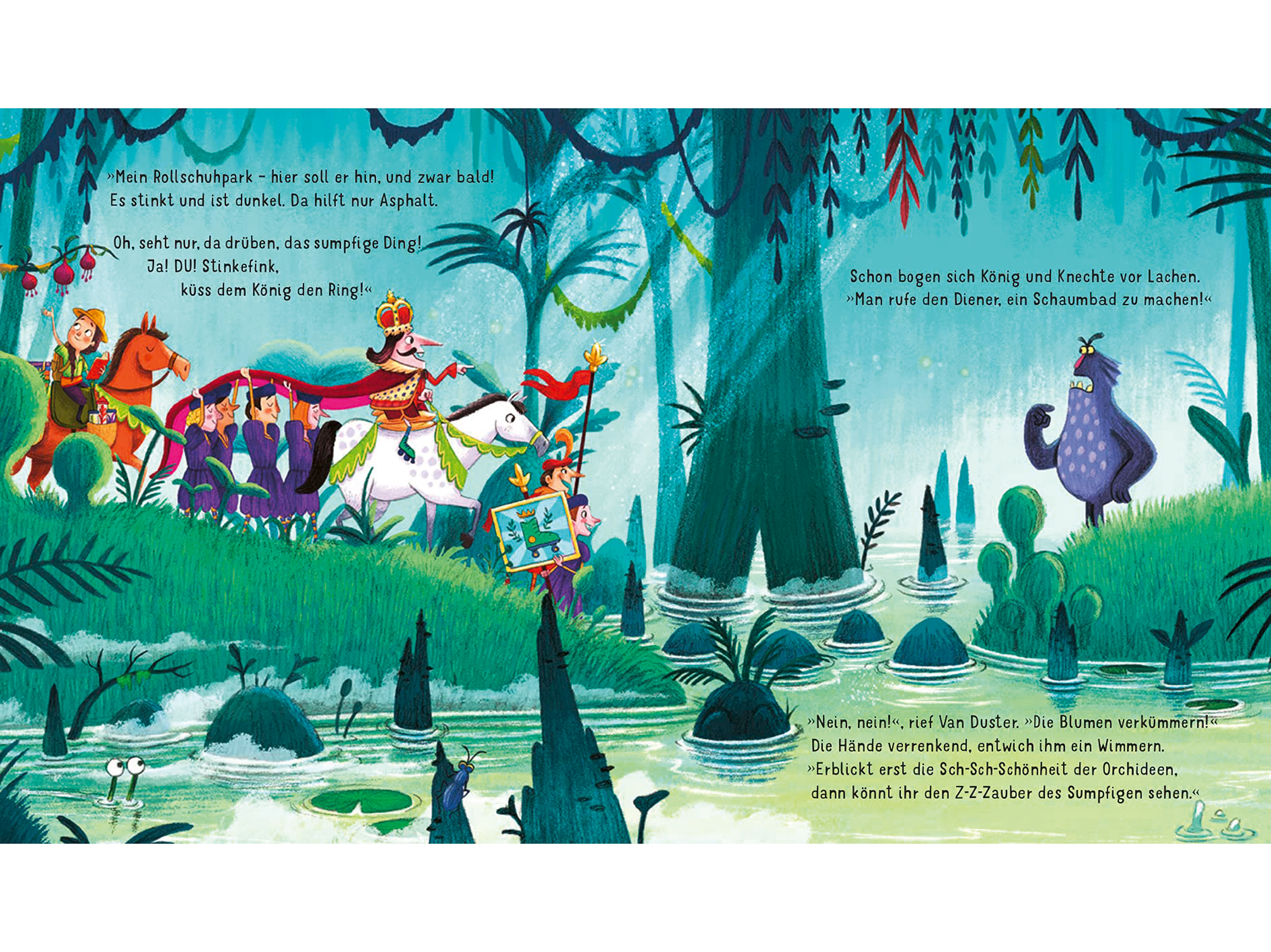 Kinder lieben Reime, Könige, Prinzessinnen mit grünem T-Shirt, Schmetterlinge und natürlich lila Monster, die in Wirklichkeit ganz lieb sind. Alles zusammen gibts in dem kunterbunten Bilderbuch über den Sumpfkönig Van Duster, der sich furchtbar über die gefrässigen Raupen ärgert bis eines Tages...