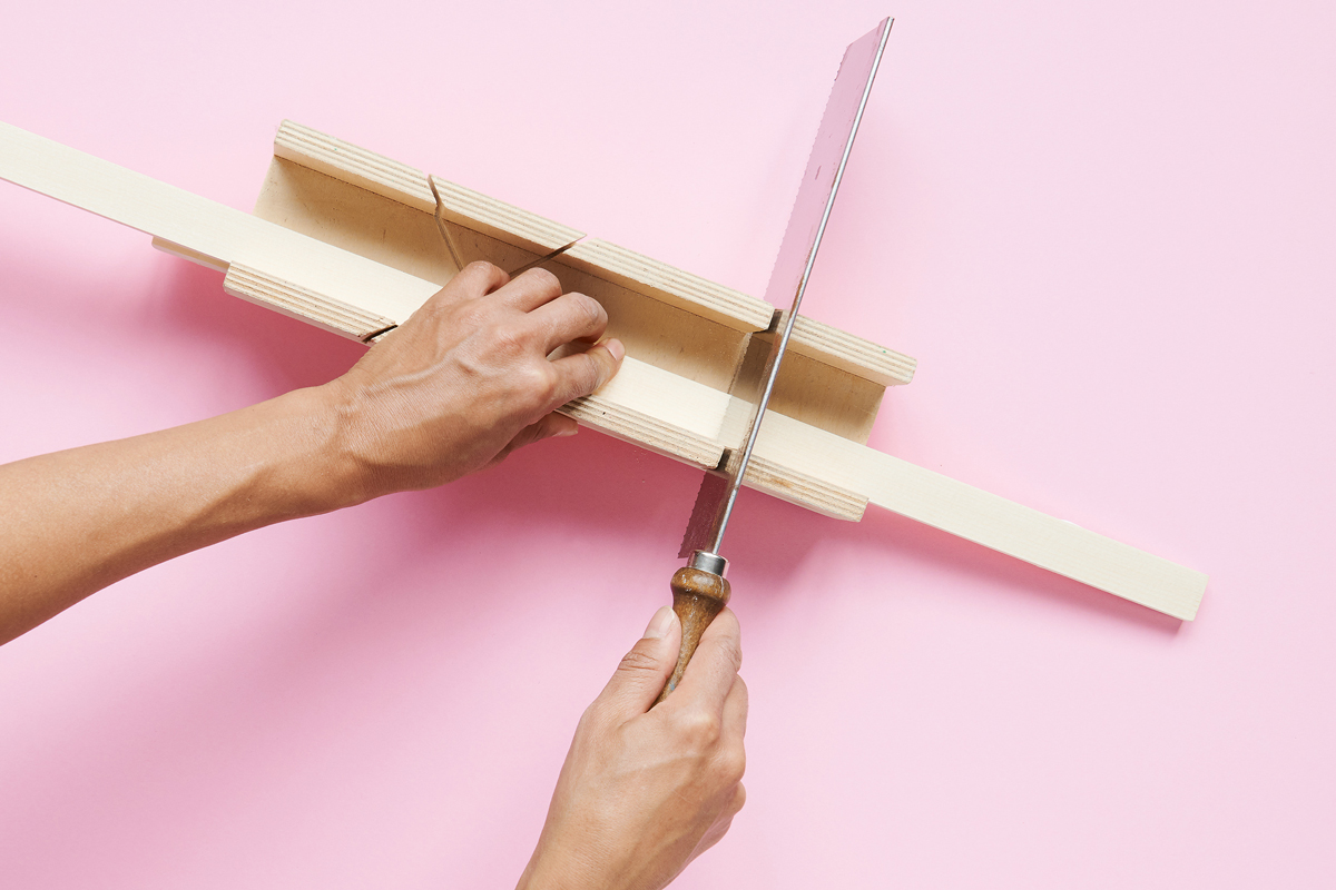 1 Rechteckleisten zusägen: Benötigt werden jeweils zwei Leisten in gleicher Länge, die kürzesten sind 10 cm lang, die längsten 60 cm lang. Zwischengrössen ab 10 cm in 5-cm-Schritten zusägen.