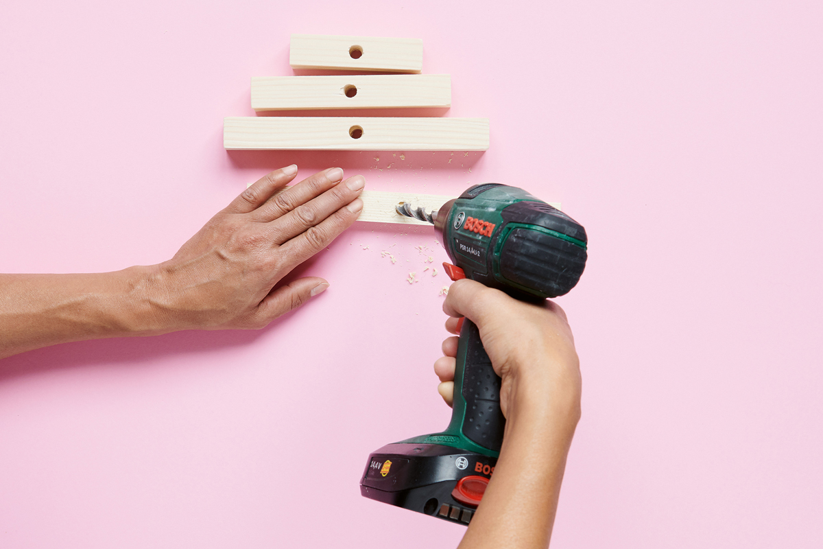 2 Bei allen Leistenzuschnitten mittig mit dem Akkubohrer (10 mm) ein Loch bohren. Kanten und abstehenden Holzspäne abschleifen.