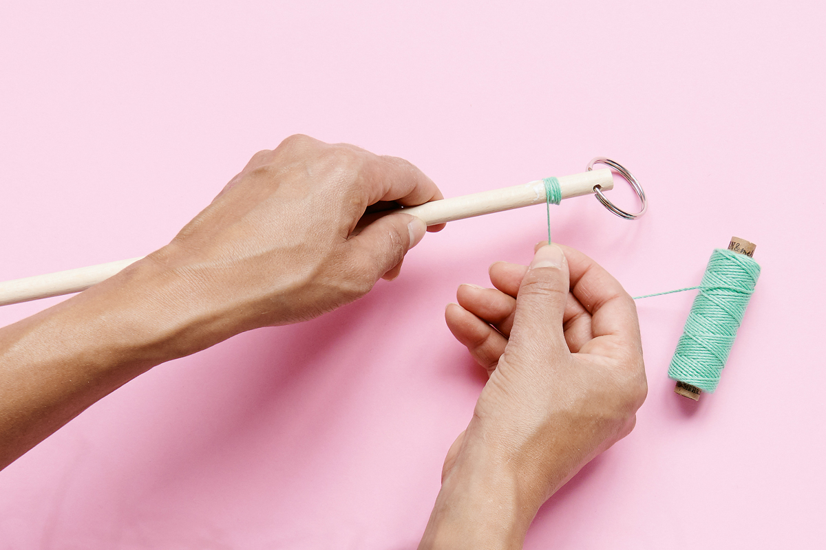 3 Rundholz auf ca. 65 cm ablängen. An einem Ende ein Loch bohren (Ø 6 mm). Den Schlüsselring hineindrehen. Das Rundholz aufhängen. Mit der ersten Garnfarbe unterhalb des Rings ein Stück von ca. 1 cm umwickeln. Garnanfang und -ende mit Bastelleim auf dem Rundholz fixieren. Von unten das erste Hölzchen (kleinste Grösse) auf das Rundholz schieben bis zum Garngewickel.