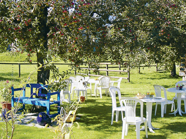 Fast wie in einem Werbespot. Im Café Mäntig sitzt man unter alten Obstbäumen auf der Wiese, Schildkröten krabbeln in einem Gehege, für die Kinder gibts Tret-Trecker zum Herumfahren und Strassenkreide, um den Hof des Bauern zu bemalen.