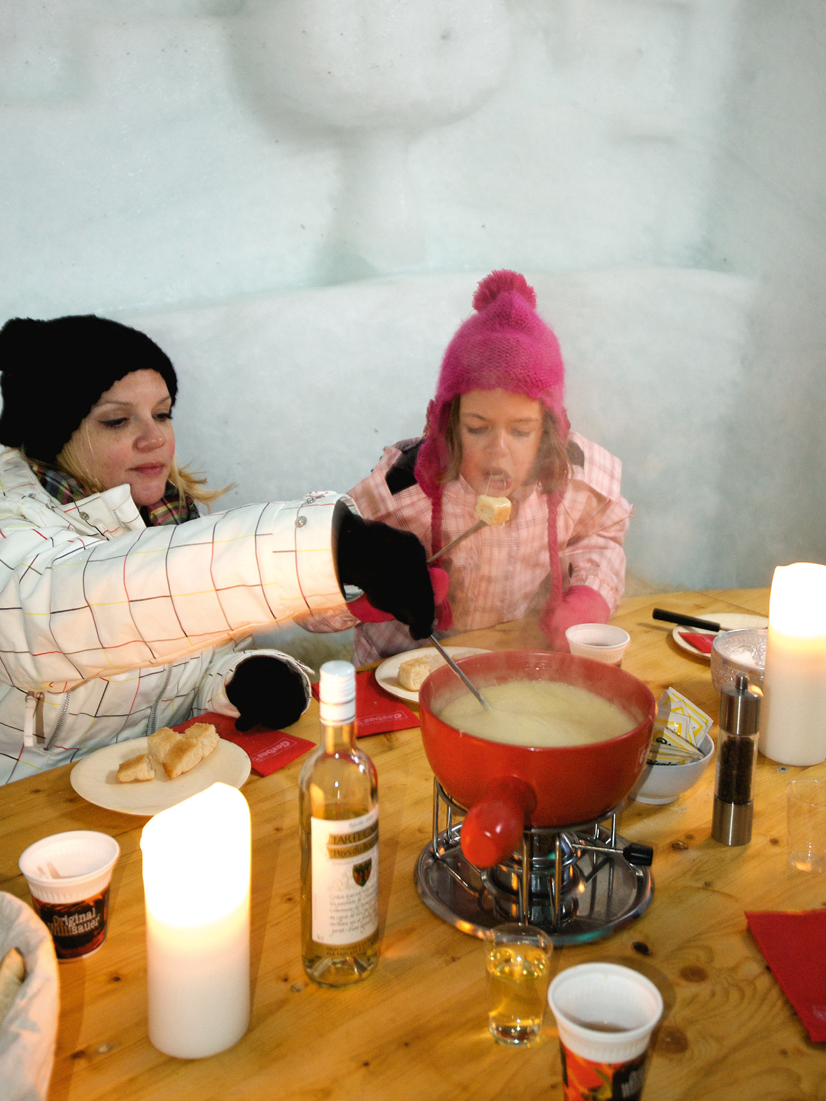 Im grossen «Restaurant-Iglu» gibts Fondue à discrétion und heissen Tee. In Decken gehüllt, sitzen die Gäste auf Schaffellen, ziehen Käsefäden und plaudern miteinander. Unsere Mädchen kriegen derweil vor Kälte rote Näschen und wollen endlich in ihre Schlafsäcke schlüpfen – für sie beginnt das Abenteuer jetzt.