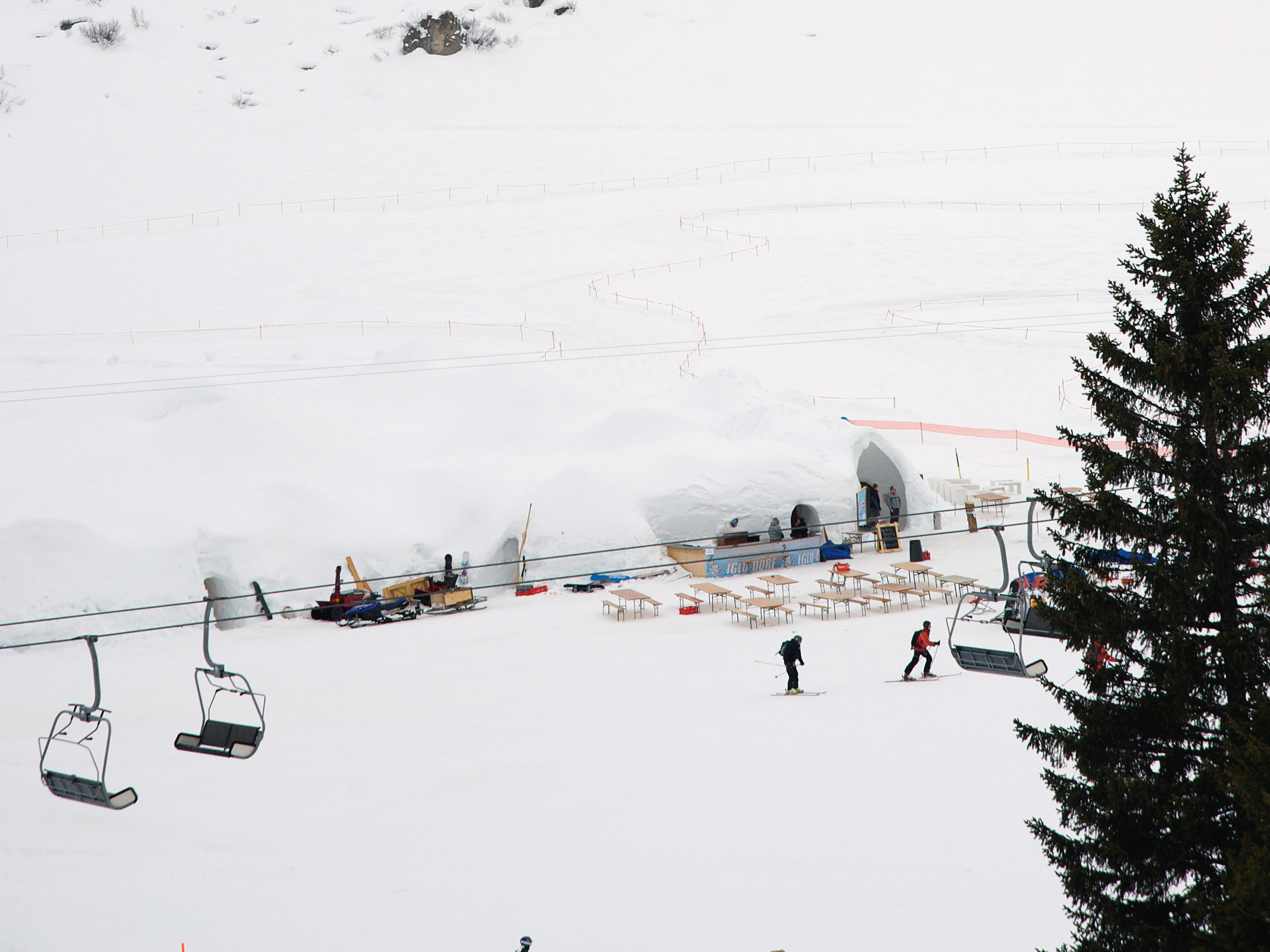 Eingepackt wie für eine Nordpol-Expedition stapfen wir mit den andern aus der 30-köpfigen Gruppe auf einen grossen Schneehaufen zu, der sich erst auf den zweiten Blick als Iglu-Dorf entpuppt. Hinter der im Schnee eingelassenen Holztüre liegt eine aufwändig geschnitzte Eis-Bar, auf dem Tresen flackern Kerzen.