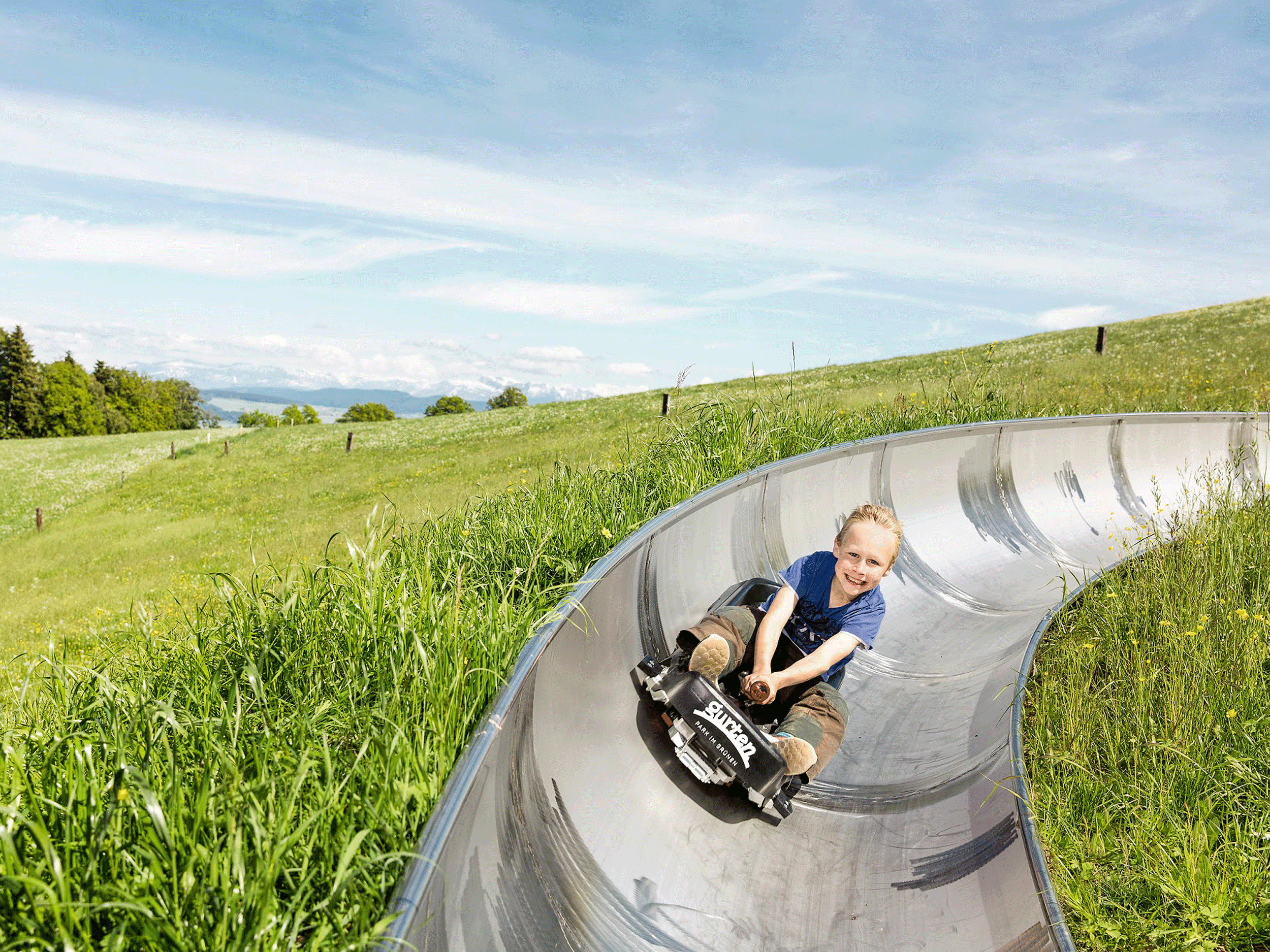 Langenbruck (BL): 1000 Meter lang ist diese Wannenrodelbahn. Angetrieben durch Sonnenkraft tuckert man auf dem Rodel den Berg hoch – und mit Tempo wieder runter, durch mehrere Steilwandkurven und den einzigartigen 540-Grad-Kreisel. Ab 6 Jahren, 3 Franken.