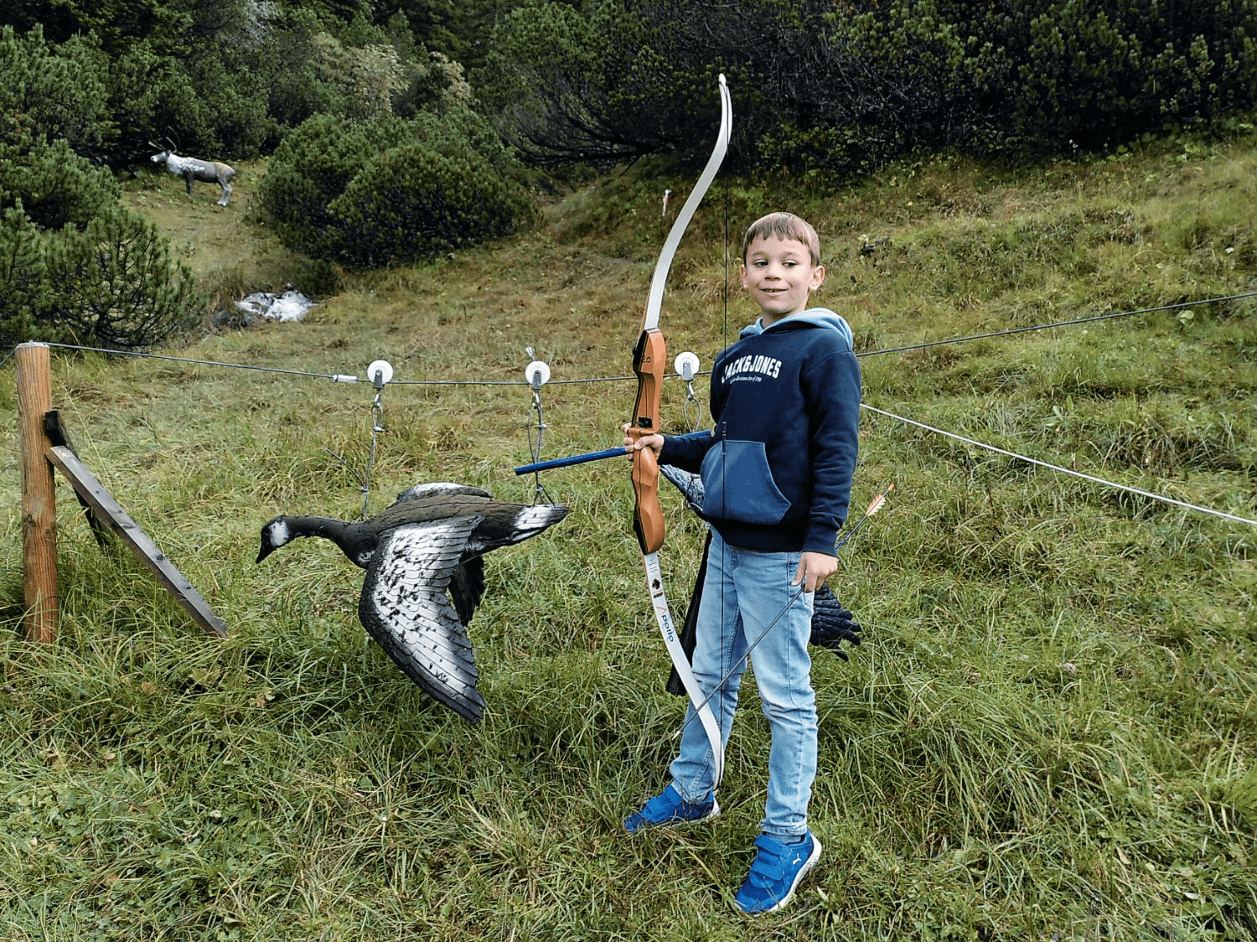 Endstation. Nachdem sich der Bus 20 Minuten den Berg hochgeschraubt hat, gehts nur noch mit der Sesselbahn weiter. Oder zu Fuss. Welch ruhige Idylle hier oben! Im weitläufigen Hochtalkessel liegen die Holzhäuser locker hingestreut und beherbergen zu jeder Jahreszeit vor allem Familien. Wo andere Ferienorte sich mehr aus Marketinggründen als «familienfreundlich» bezeichnen, trifft dies bei Malbun wahrhaftig zu. Kein Wunder, wurde die Region mehrfach mit dem Gütesiegel «Family Destination» ausgezeichnet. Wie aber kommt es, dass ein ganzes Dorf Kindern gegenüber so offen ist ? Weil viele Menschen hier sind wie Johann Beck. Der Bogenschiess-Coach macht den achtjährigen Nikola innerhalb einer halben Stunde zu einem angefressenen Bogenschützen. Am Dorfrand stehen zunächst nur ein paar Zielscheiben. Hier wird das Spannen des Bogens und das intuitive Loslassen des Pfeiles trainiert. Unsere ins Dickicht verschossenen Übungspfeile sammelt Johann nach jeder Serie geduldig ein. Als wir endlich mehrheitlich die Zielscheiben treffen statt die Botanik, geht der Spass so richtig los. Wir pirschen auf einem langen, schmalen Pfad immer höher ins Gelände. Entlang des Weges stehen an 28 Parcours-Posten halb versteckt Tierattrappen aus geschäumtem Material. «Cool, ein Wildschwein!», ruft Nikola und schon spannt er wie ein Profi den Bogen. Nicht getroffen. Egal, bei jedem Tier dürfen wir dreimal probieren. Auf die Wildsau folgen Fuchs, Karibu, Wolf, Bär, Murmeltier und viele weitere Wildtiere – Nikolas Jagdinstinkt ist geweckt. Und ehrlich: Auch ich als Umweltschützerin und Vegetarierin komme total auf den Geschmack des Jagens.