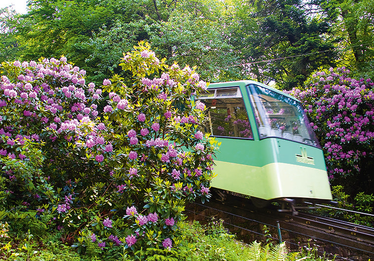 Schweizer sind in Sachen Zahnradbahnen verwöhnt, aber auch das Bähnchen auf den 668 Meter hohen Merkurberg ist nicht ohne. Seit 1913 zuckelt es in einem Winkel von 54 Prozent steil bergauf. Oben warten: Liegen, rapunzelwürdiger Turm und − Aussicht.