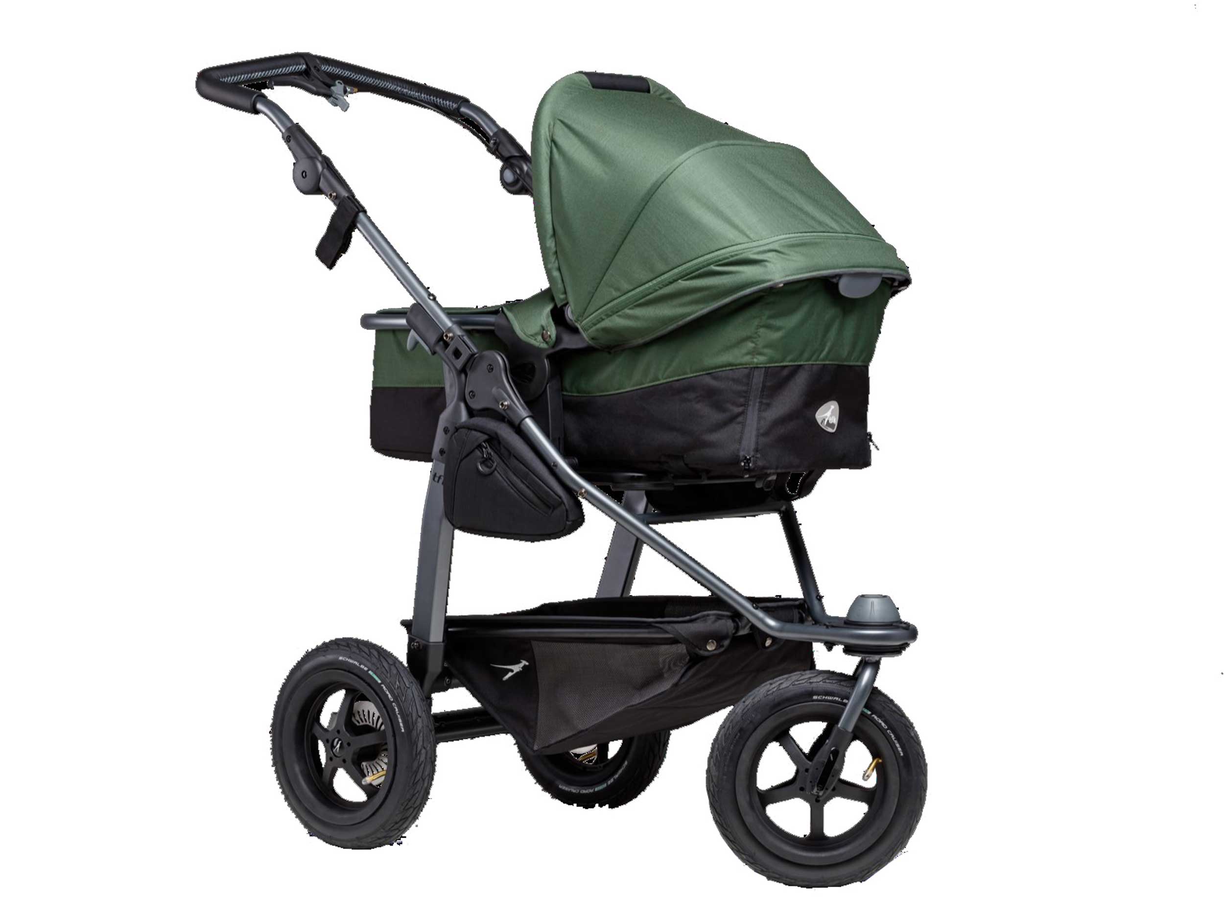 TFK Mono: Der Drei-Rad-Kombikinderwagen meistert dank seiner grossen Räder und der Federung jedes Terrain. Er trägt den liebevollen Spitznamen Traktor, und ist vor allem bei Eltern beliebt, die täglich ihre Runden im Wald oder auf dem Berg drehen. Auch joggend, denn der Wagen ist in der Sitzstellung offiziell zur sportlichen Nutzung zugelassen. So hat er eine Scheibenbremse, die sich per Hand bedienen lässt. Und sobald die Kleinen etwas von der Welt sehen möchten, lässt sich das Kopfteil der Babywanne erhöhen, ohne sofort auf den Sportsitz umstellen zu müssen.