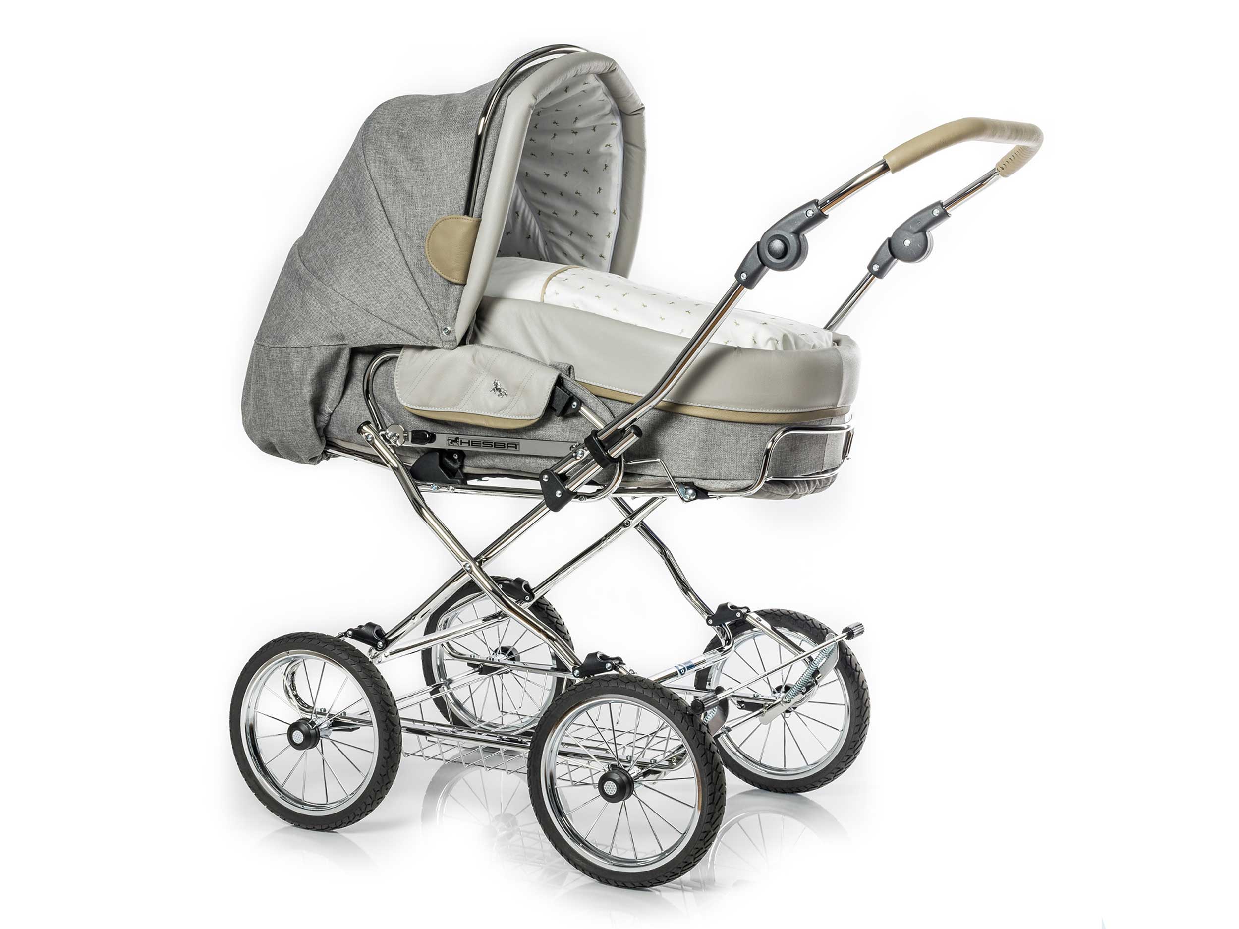 Condor Coupé Kombikinderwagen von Hesba: Der Condor Coupé ist wohl unumstritten der Schönheitskönig unter den Wägen, die derzeit in den Parks kursieren. Der nostalgische und schicke Kombikinderwagen verzichtet dennoch nicht auf aktuelle Annehmlichkeiten: Er ist gefedert, sein Schieber ist höhenverstellbar, und es gibt einen Sportsitz dazu, dessen Rückenlehne ebenfalls verstellbar ist, sodass er in nichts seinen Altersgenossen hinterherhinkt. Ausser vielleicht im Gewicht: Das Stahlgestell bringt zusammen mit dem Wagen doch fast 20 Kilogramm auf die Waage, was Reisen – selbst mit einem Offroader – beschwerlich machen dürfte.