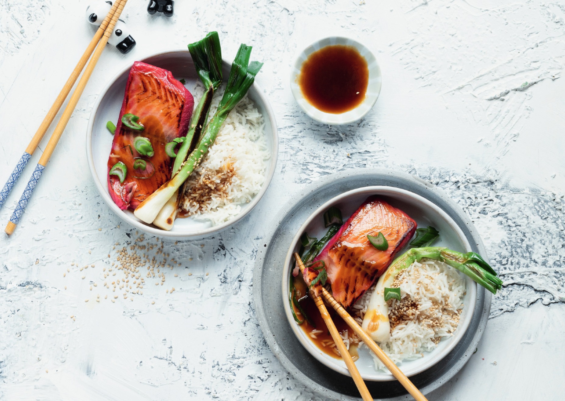 5 Frühlingszwiebeln beigeben und kurz mitbraten. Der Lachs soll innen noch leicht rosa sein.