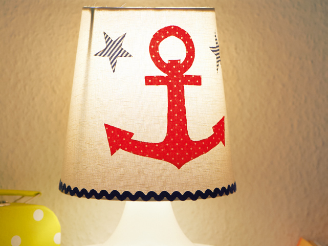 3 Das Stoffsujet mit Bastelleim auf dem Lampenschirm fixieren. Nach Belieben Bordüren anbringen.