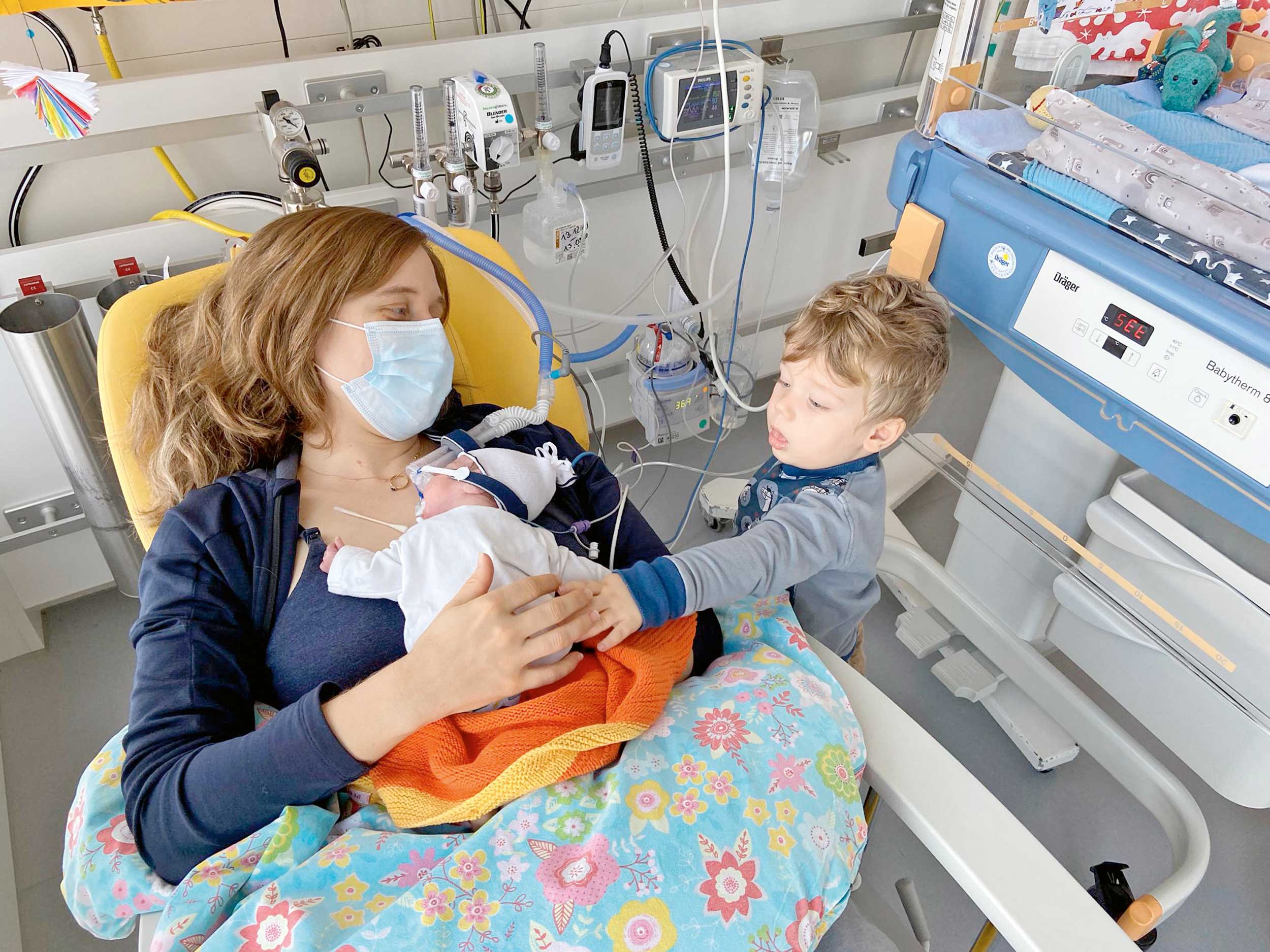 Ein Raum voller Technik, voller Emotionen. Vier Isoletten standen in unserer Koje in nicht allzu grosser Distanz zueinander. Darin je ein klitzekleiner Bub. Hinter jedem Plätzchen ein Monitor, neben dem Bett eine Beatmungsmaschine. Über der Technik prangten Mitbringsel für die Babys: Karten, Zeichnungen, Stofftiere. Der Geräuschpegel war oft laut: Eltern, die sich mit Spezialist* innen austauschten, Alarme, professionelle Milchpumpen, das Brummen der Apparaturen. Notfälle waren an der Tagesordnung. Dann kam ich mir jeweils vor, als würde ich einem Autounfall zusehen. Mit meinem Baby auf der Brust. Im Wissen darum, dass mein Kind genau gleich gefährlich unterwegs war.