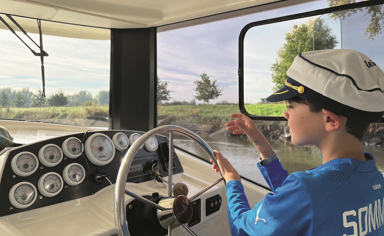 Ab zwei Erwachsenen pro Boot geht es los. Dass einem ein so grosses Schiff (11,5m) ohne Führerschein überlassen wird, ist beeindruckend, aber ganz schnell auch normal. Die Steuerung ist dank Bug- und Heckstrahlern simpel und das Tempo gemächlich (maximal 12 km/h). Dank genauster Routenbeschreibung kann man sich nicht verfahren, aber überall, wo es einem gefällt, anhalten. Und seekrank wird garantiert auch niemand.