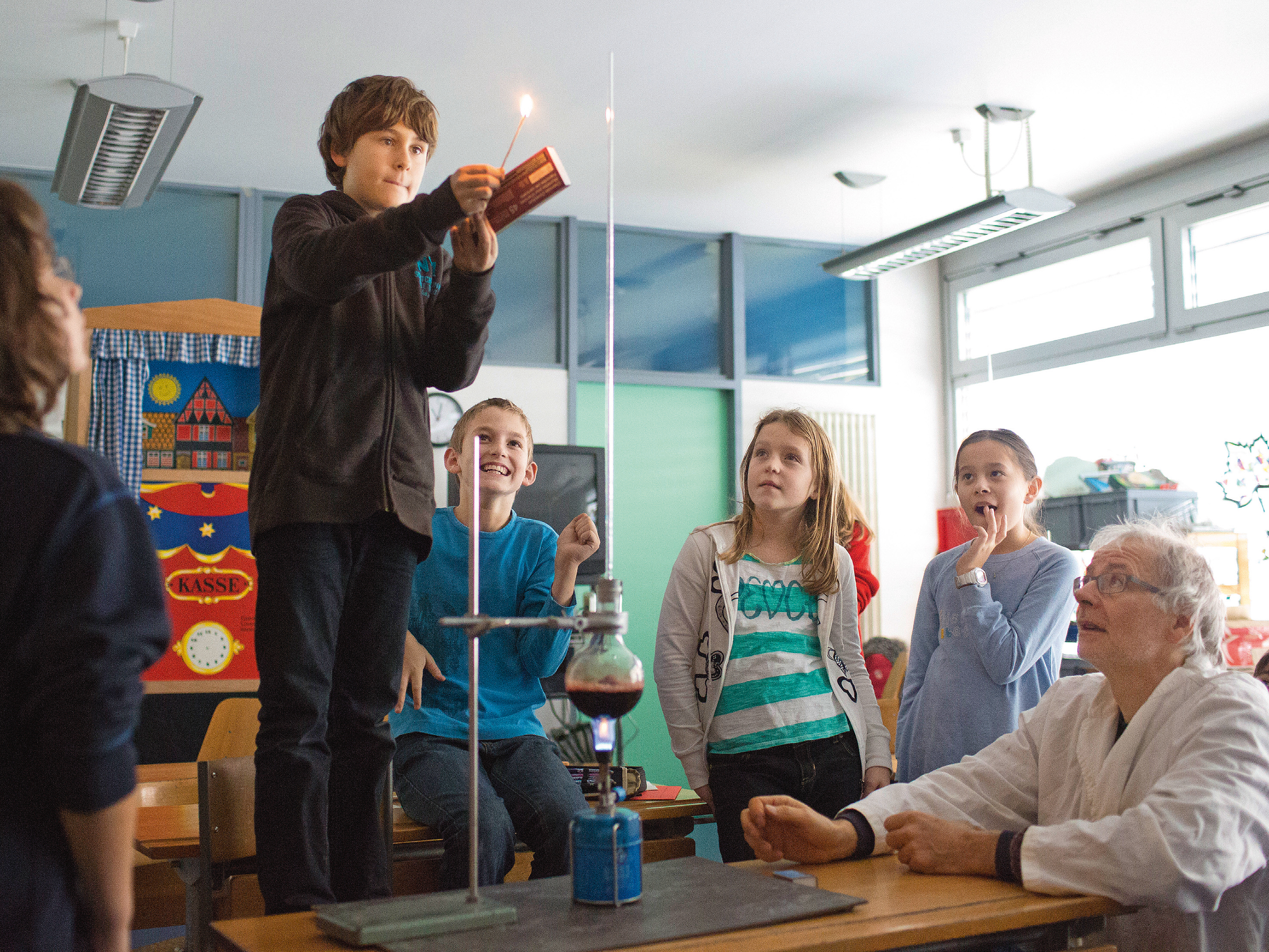 Konzentriert hocken jetzt die Jungs und Mädchen der Gruppe Blau an ihren Bunsenbrennern. Der ganze Raum riecht wie ein Weihnachtsmarkt. Über den Flammen blubbert Rotwein. «Wenn Alkohol kocht, verdampft er nämlich und das Coolste: man kann ihn in Brand setzen», erklärt Julia und hält ein Streichholz an die Schwaden. Zischen, Flamme, Jubel der Gschpänli. Der Unterricht läuft hier selten im Klassenverband. Projektarbeit, eigenständiges Tüfteln, Lernen im individuellen Tempo sind hier Prinzip.