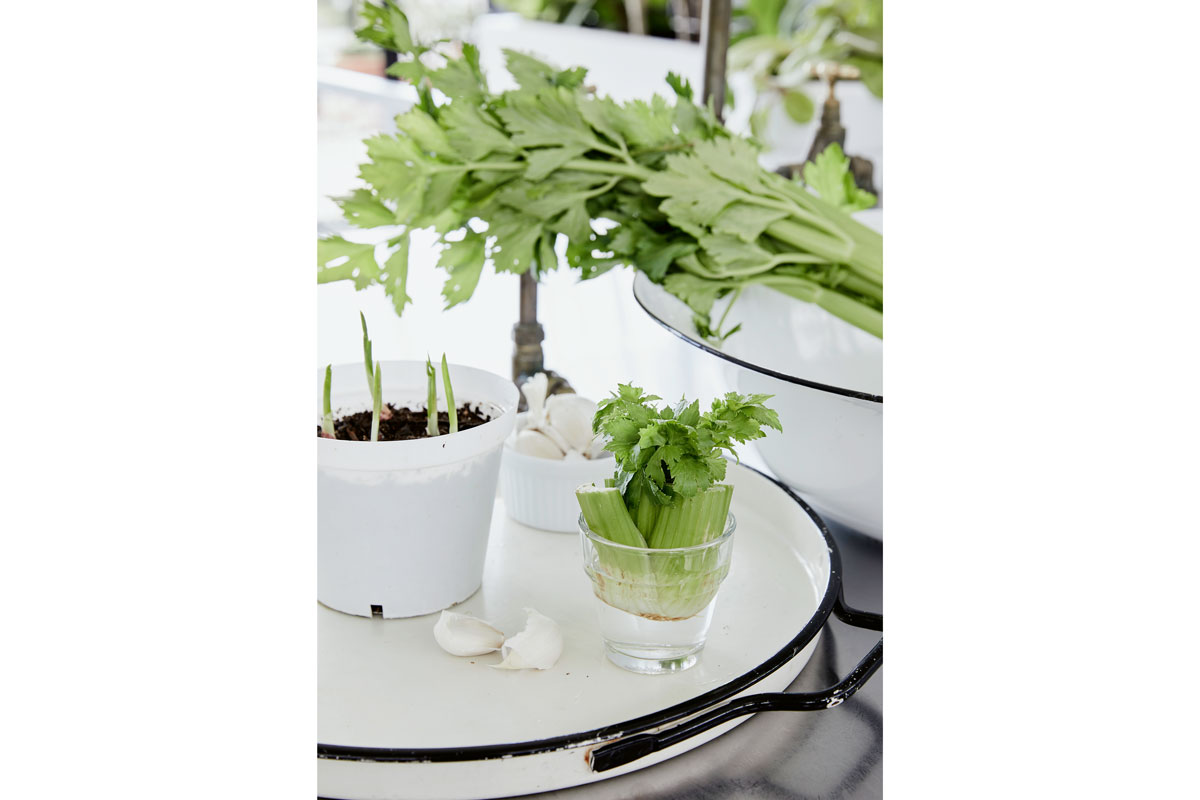 1 Die Blattstiele des Stangenselleries aufbrauchen, die Knolle in einem Gefäss mit temperiertem Wasser platzieren.