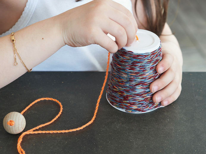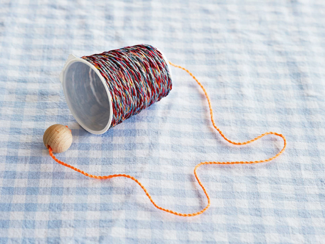 3 Einen Zahnstocher am einen Ende der Schnur/des Garns befestigen und in den Becher ziehen. Am andern Schnurende eine Holzkugel, einen Styroporoder Pingpongball festbinden. Und rein mit der Kugel in den Wurfbecher ...
