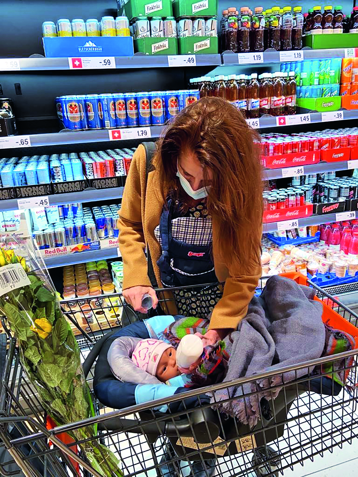 11.10 Uhr: Brot gekauft, Blumen, Kartoffeln… Was brauchen wir noch? Wäääähhh! Das darf doch nicht wahr sein. Nicht schon wieder! Rausrennen geht mit vollem Einkaufswagen nicht. Dann also: Fake-Füttern vor der Kühltheke. Die Mutter schwitzt. Sehr kühl kann die Kühltheke nicht sein. Erste genervte und nervende Blicke treffen uns. Sind Menschen immer so neugierig? Müssen die so starren? Etwa noch nie einen Mann mit offen gehaltener Jacke gesehen vor einer Frau, die ein Plastik-Baby vor einem Kühlregal füttert? Laut einer Studie des Deutschen Jugendinstituts leidet jede zweite Mutter unter Stress. Jede vierte findet, ihr Stresslevel sei «hoch» oder «sehr hoch», Schwestern, an diesem Morgen bin ich eine von euch!