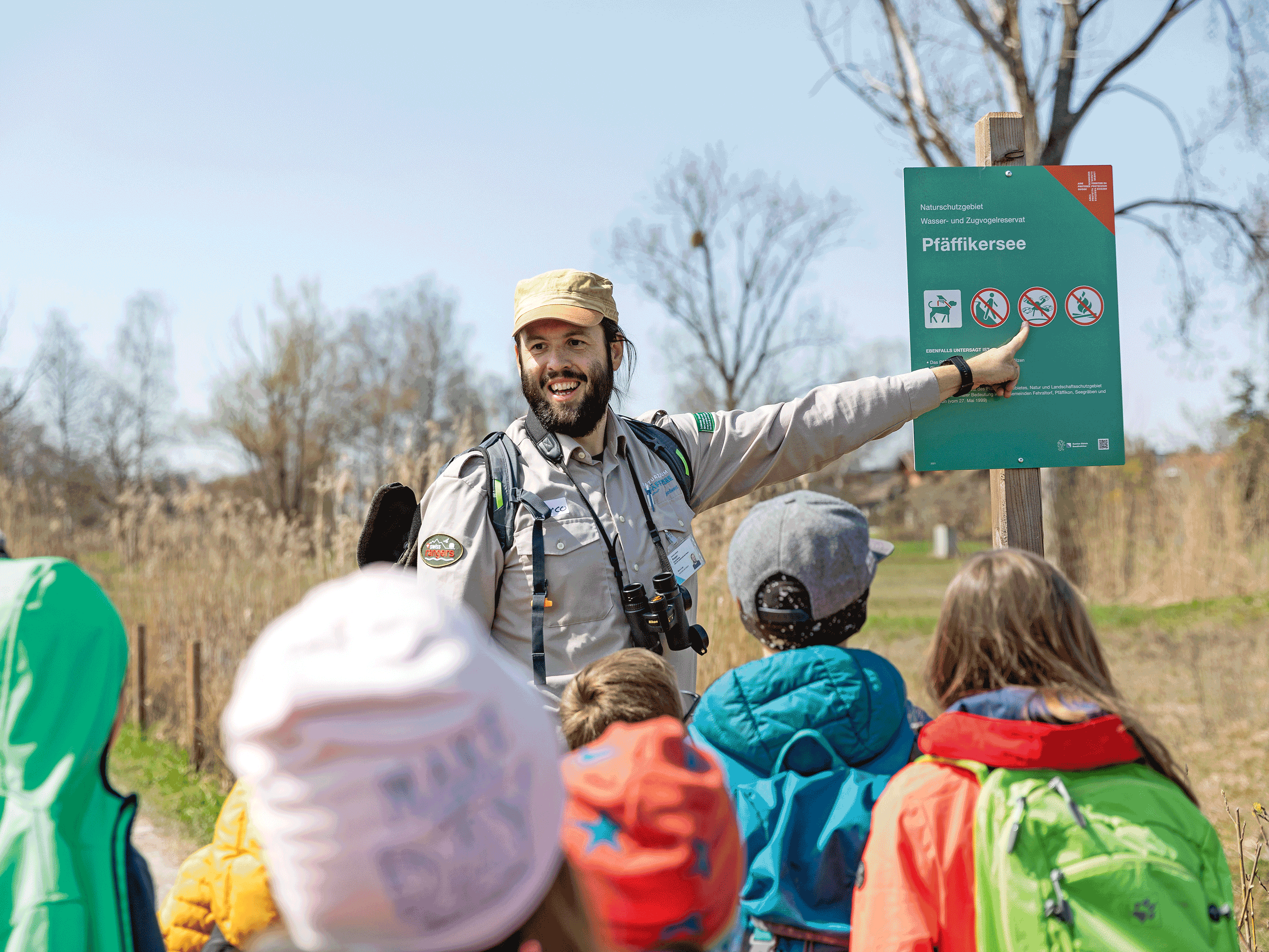 Kleiner Check zu Beginn des gemeinsamen Nachmittags: Ranger Marco Lupi bleibt vor einer Informationstafel stehen und stellt kurz sicher, dass die Kindergruppe die Regeln kennt, die in diesem Naturschutzgebiet gelten: «Darf man die gelben Blumen hier pflücken?», fragt der 38-Jährige und zeigt auf das entsprechende Piktogramm. «Nein», antworten die Kinder im Chor. «Kann man das Brot, das man nicht fertig gegessen hat, den Enten füttern?» – «Nein!» – «Ein Feuer machen?» – «Nein!» – «Überhaupt nicht?» – «Nur an einer Bratstelle», ruft Yari (7).