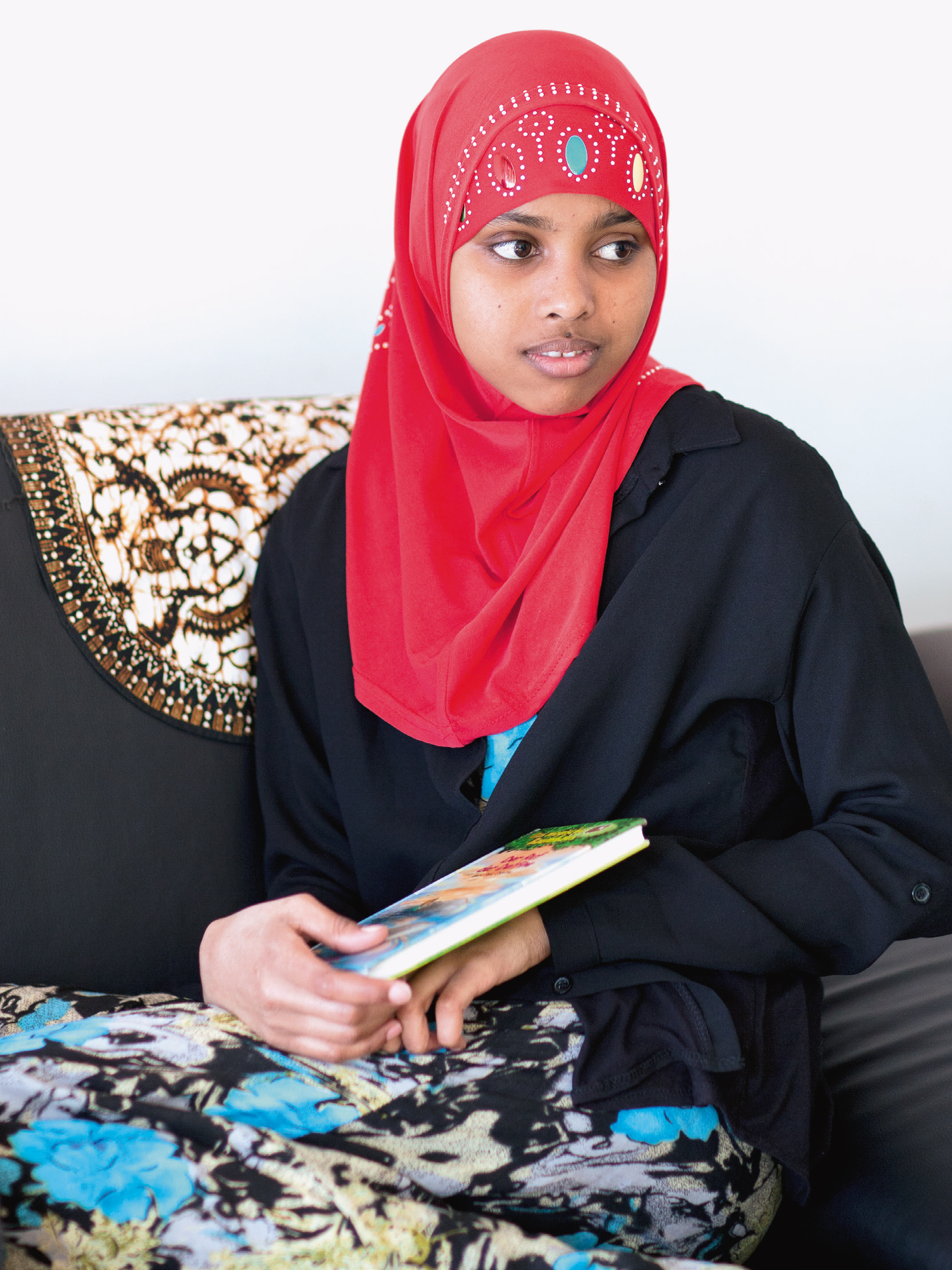 Naciimos Mutter Ubah Ali Hussein – sie hat einen ebenso freundlichen und wachen Blick wie ihre Tochter – betont, dass sie ihre Tücher absolut freiwillig trage. Sie habe im somalischen Krieg ihren Vater, den Ehemann und einen Bruder verloren, musste fl iehen und lebte fast zwei Jahre ohne ihre Kinder in der Schweiz. Was genau geschah, darüber kann sie nicht reden. «Die Zeit war zu schmerzhaft für mich.» Aber gerade sie habe durch den Verlust ihrer männlichen Angehörigen niemanden, der ihr und ihren Töchtern diktiere, das Kopft uch oder den Niqab zu tragen. Sie machten es alle, weil sie es wollten. Sie gesteht zwar ein, dass es hierzulande sehr umständlich wäre, ein Ganzkörpertuch wie in ihrer Heimat zu tragen. «Nur schon das Rennen auf den Bus wäre sehr behindernd », lächelt sie. «Trotzdem wäre es mir ohne ein Tuch über meinem Haar ebenso unangenehm, wie es wohl für eine westliche Frau unangenehm wäre, ein solches zu tragen», versucht sie ihre Empfi ndung zu beschreiben.