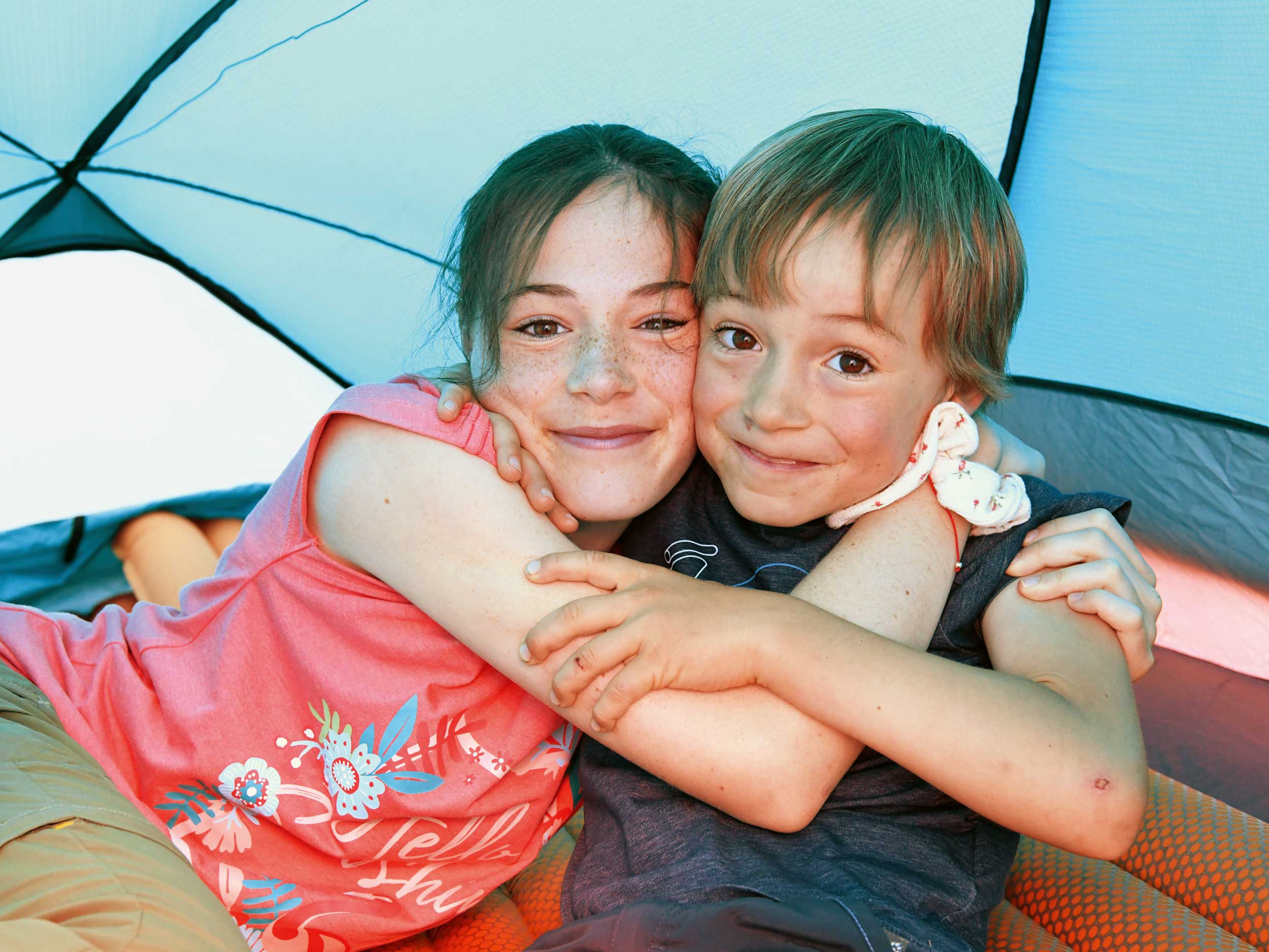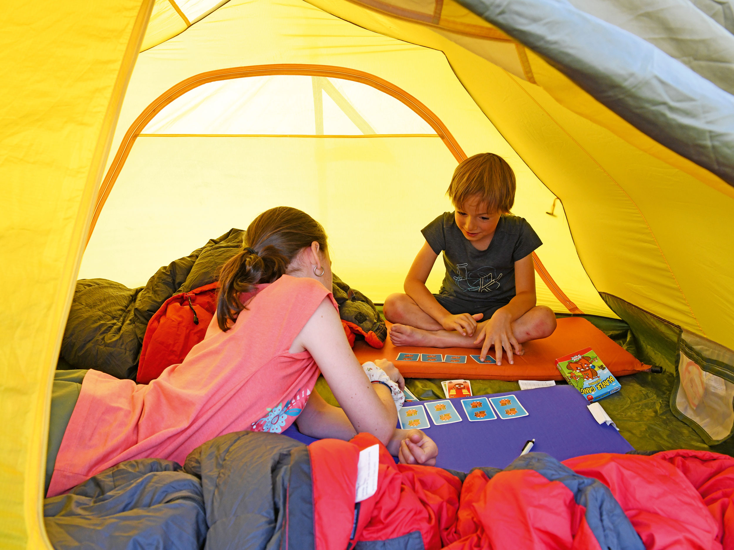 Da kommt ihm in den Sinn, dass er Papa noch nicht richtig Gute Nacht gesagt hat. Also nochmals nach draussen! Jonathan rennt zum Vater, der wie eine Mumie verpackt im Schlafsack liegt, und hüpft auf dem Rückweg zum x-ten Mal über die Zeltschnüre. Mit scheinbar endloser Energie. Wieder im Schlafsack, raschelt es vor dem Zelteingang. Anushka steckt den Kopf zur Zeltöffnung hinein. Sie will den Schlafsack tauschen in der Meinung, meiner sei wärmer.