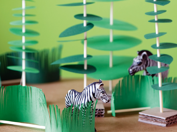 4. Aus Well-Karton «Baumfuss» zuschneiden und Blätterspiess einstecken. Auch hier am besten das Karton-Loch mit einem Tupfer Leim versehen – so bleibt das Mini-Bäumchen auch standfest.